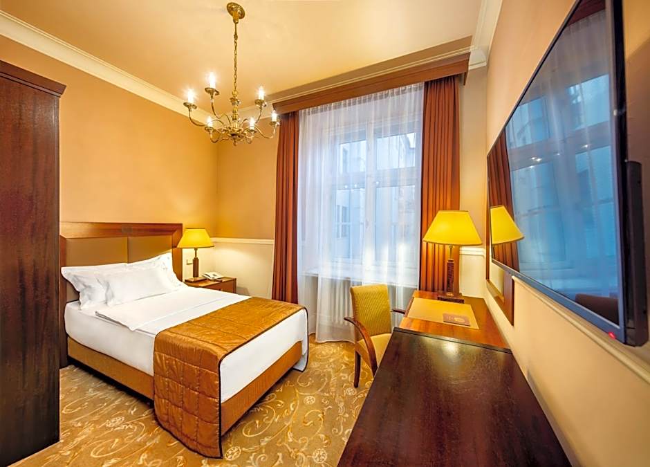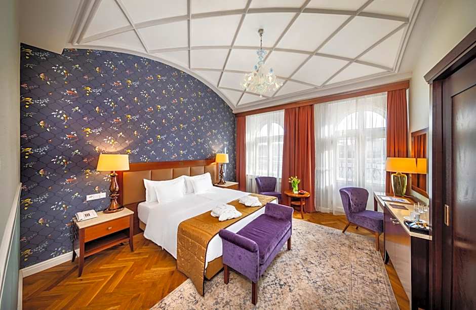 The spacious Executive Rooms located on the 6th and 7th floors offer a city view are equipped with rain shower Hüppe, bathrobes,Vittore De Conti cosmetics, slippers, oak wax polished parquet, Murano crystal chandelier and decorated with Fischbacher wallpapers. Highspeed Wi-Fi a Nespresso coffee machine, and a free bottle of mineral water on arrival.